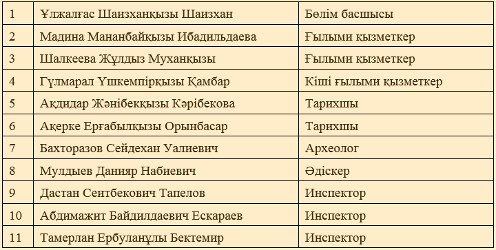 «Ежелгі Тараз ескерткіштері» мемлекеттік тарихи-мәдени музей-қорығы «Ғылыми қызмет және ескерткіштерді қорғау» бөлімінің қызметкерлері: