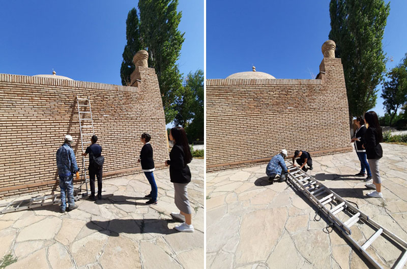 Қазақстан Республикасы Мәдениет және спорт министрлігі, Мәдениет комитетінің “Казреставрация” Республикалық мемлекеттік кәсіпорнының архитекторлары Тараз қаласында орналасқан республикалық маңызы бар Қарахан және Дәуітбек (Шамансұр) кесенелерінде мониторинг жұмыстарын жүргізу үстінде.