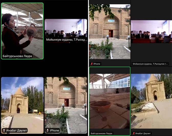Жамбыл облысы, Мойынқұм ауданы, Тұрар Рысқұлов атындағы орта мектеп білім алушыларына «Ұлы Дала елі Тәуелсіздіктің 30 негізі» акциясы аясында «Тәуелсіздік-ұлт мақтанышы» атты («Zoom» платформасы арқылы) онлайн экскурсия жүргізілді. «Ежелгі Тараз ескерткіштері» тарихи-мәдени қорық-музейінің қызметкерлері білім алушыларға тарихи-мәдени мұраларымызды насихаттай отырып,ежелгі қала, үлкен руханият орталығы болған Тараз шаһарының тарихымен және археологиялық қазба жұмыстары нәтижесінде табылған бірегей құнды экспонаттарды көрсетіп, сипаттамларына тоқталып, таныстырды. Онлайн форматта өткізілген экскурсияға ортағасырдың інжу-маржаны «Айша бибі», Әулие ата атанған «Қарахан» кесенелері, шаһардың шырайын кірігізіп, ажарын ашып тұрған «Көне Тараз» этномәдени кешені назарларына ұсынылды. Экскурсия оқушылардың қызығушылығын тудырды, олар ежелгі Тараздың тарихы туралы қызықты және мазмұнды дәріс тыңдады. Музей қызметкерлері балаларды өз өлкесін сүюге, оның бай тарихын білуге және өз елінің патриоты болуға шақырды.