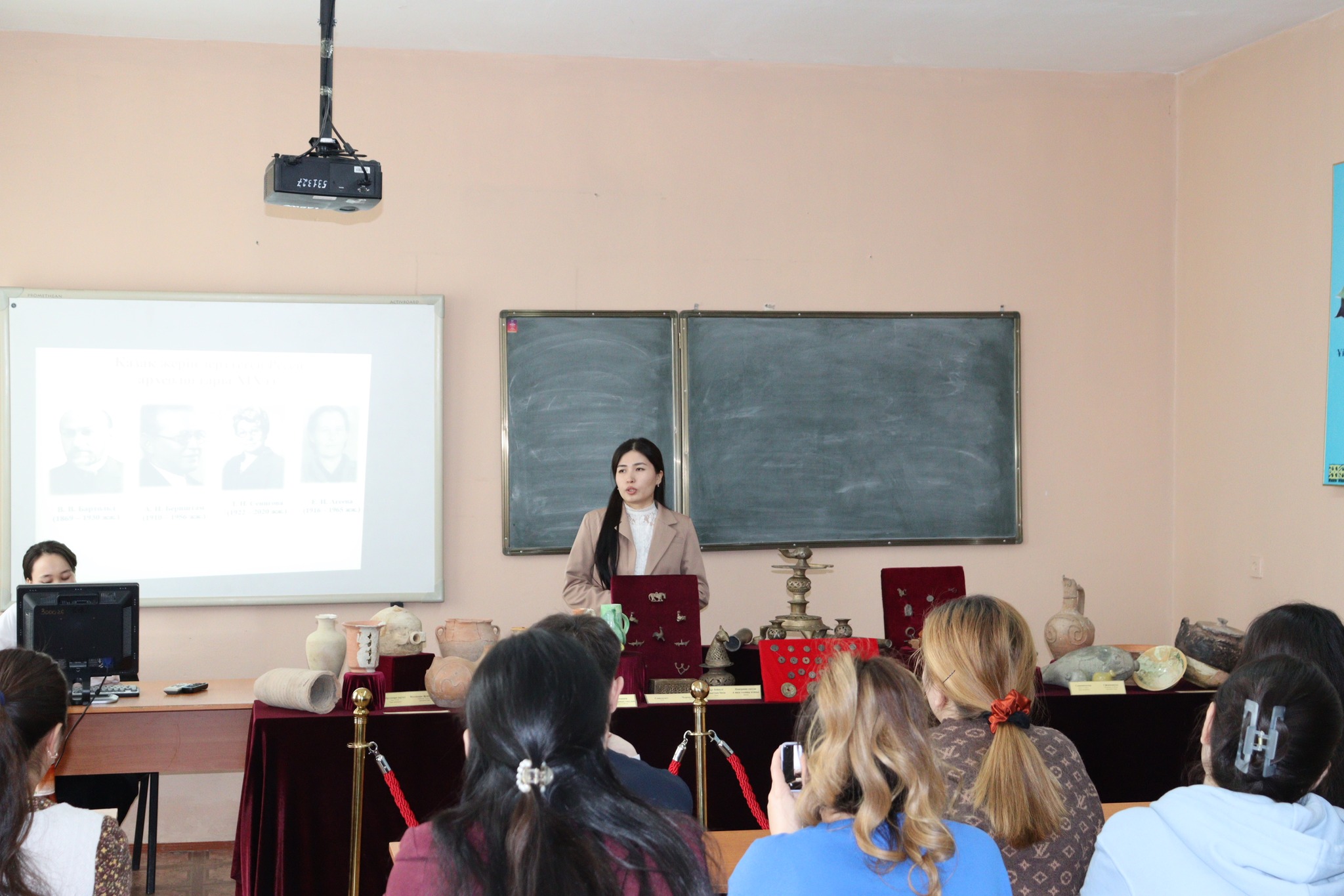 Сондай-ақ, студенттер назарына археологиялық қазба жұмыстары нәтижесінде табылған жәдігерлер ұсынылды. Атап айтсақ, әр кезеңге жататын мәдени қабаттан табылған қыш бұйымдары мен металдан жасалған бұйымдардың мерзімін, жасалу техникасы мен пайдалану мақсатын түсіндірді.