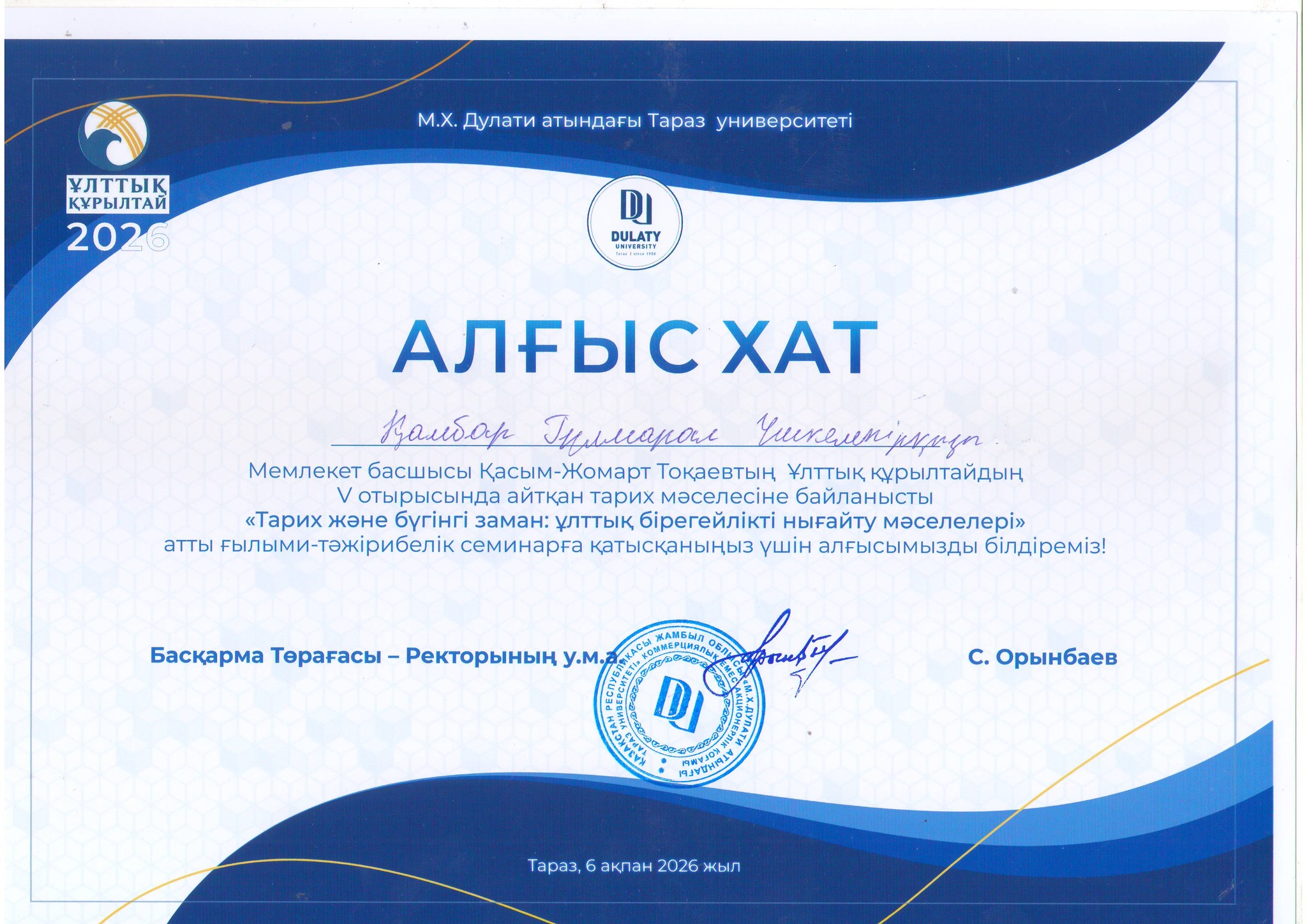 Бүгін М.Х. Дулати атындағы Тараз университетінің ұйымдастыруымен Мемлекет басшысы Қасым-Жомарт Тоқаевтың Ұлттық құрылтайдың V отырысында көтерілген тарих мәселелері аясында «Тарих және бүгінгі заман: ұлттық бірегейлікті нығайту мәселелері» атты ғылыми-тәжірибелік семинар өтті.