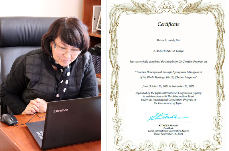 При поддержке Министерства культуры и спорта Республики Казахстан и при содействии Японского агентства международного сотрудничества Japan International Cooperation (JICA) с 18 октября по 18 ноября т.г. проходило обучение по онлайн-программе JICA "Развитие туризма через надлежащее управление объектами Всемирного наследия". В течение месяца лучшие специалисты и профессора из Центра перспективных исследований в области туризма Университета Хоккайдо, Киото (Рицумэйкан) делились опытом Японии по сохранению и использованию объектов Всемирного наследия,по развитию туризма,продвижению экомузеев и т.д. По окончании курса и выполнения Итогового отчета были вручены Сертификаты, один из которых получила заместитель директора по научной части музея-заповедника Алимжанова Галия.