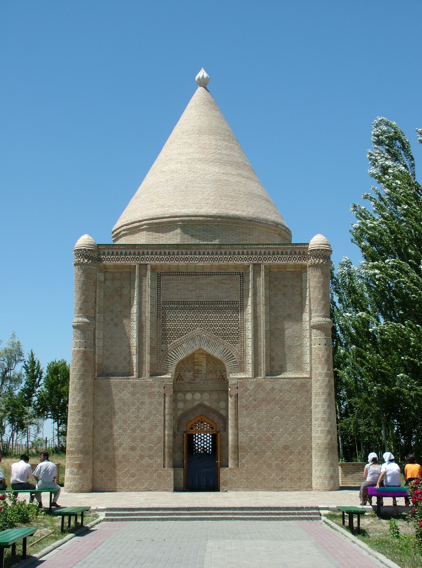 Кесене жобасы шаршы формалы бұрыштарында коллоналары бар құрылыс. Кесене қабырғаларының сыртқы жағы қолдан ойылған ою-өрнектері бар 62 түрлі терракот қыш тақталармен көмкерілген. Әр қилы үйлесім мен нұсқалардан тұратын, түрлі өсімдік гүлдері мен геометриялық түрлер сарынындағы өрнектерге бай. Бұл орталық Азия мен Қазақстандағы өнбойы ою-өрнектермен көмкерілген жалғыз ескерткіш.