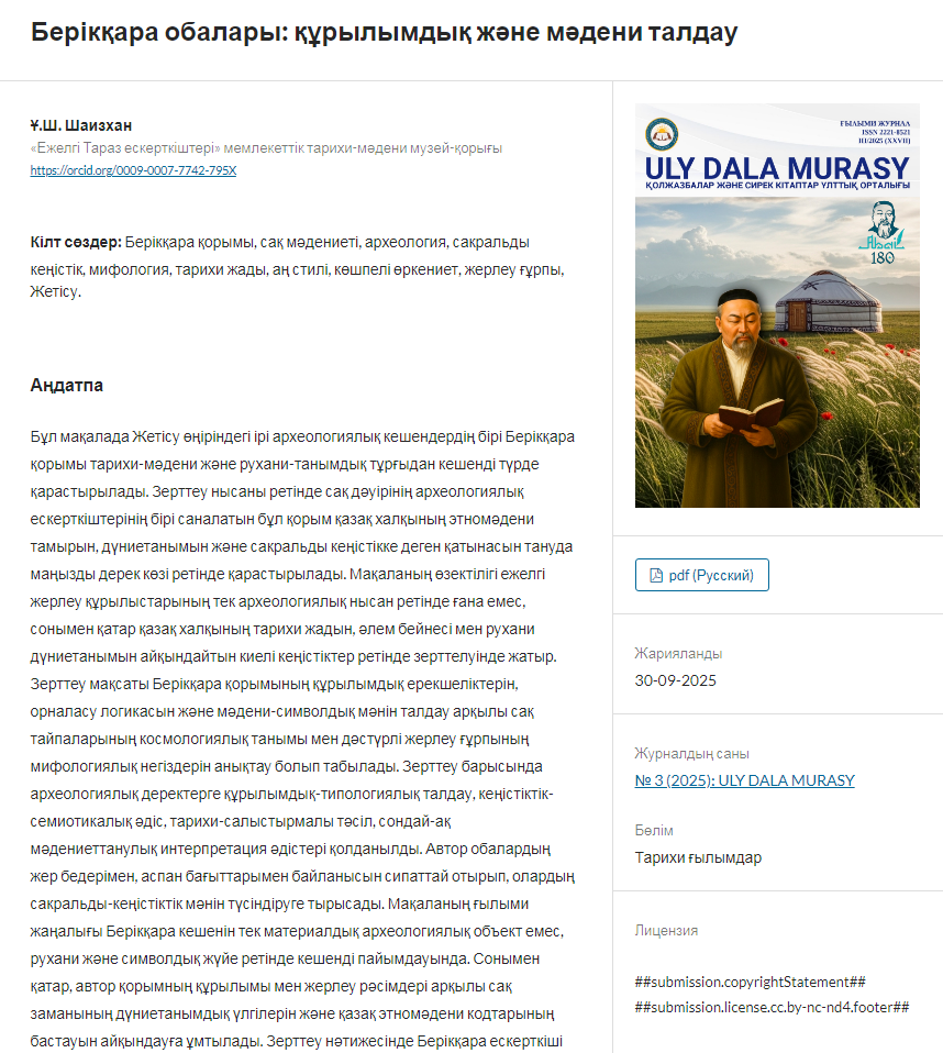 “Ежелгі  Тараз  ескерткіштері”   мемлекеттік  т арихи-мәдени   музей-қорығының   “Ғылыми  қызмет және ескерткіштерді қорғау” бөлімінің басшысы Ұлжалғас Шаизханның «Берікқара обалары: құрылымдық және мәдени талдау» атты мазмұнды халықаралық мақаласы “ULY DALA MURASY”