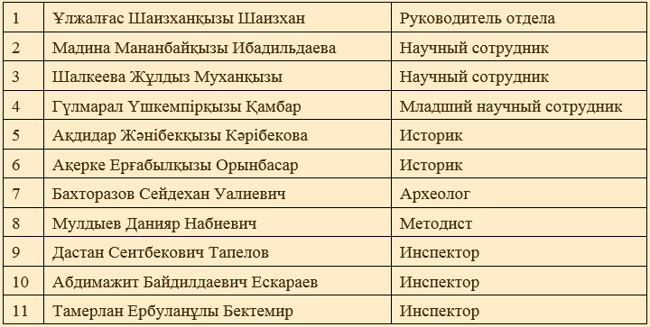 4.1. Отдел возглавляет руководитель отдела «Научная деятельность и охрана памятников», который назначается и освобождается от должности директором РГКП «Государственный историко-культурный музей-заповедник «Ежелгі Тараз ескерткіштері».