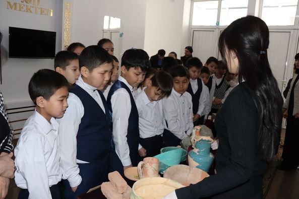 Сондай-ақ, оқушылар назарына археологиялық қазба жұмыстары нәтижесінде табылған жәдігерлер ұсынылды. Атап айтсақ, әр кезеңге жататын мәдени қабаттан табылған қыш бұйымдары мен металдан жасалған бұйымдардың мерзімін, жасалу техникасы мен пайдалану мақсатын түсіндірді.