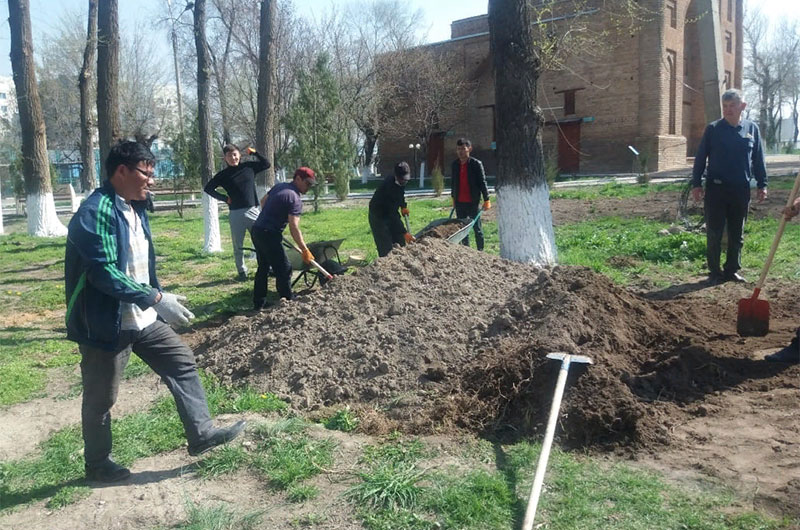 Қазақстан Республикасы Мәдениет және спорт министрлігіне қарасты «Ежелгі Тараз ескерткіштері» мемлекеттік тарихи-мәдени қорық-музейінің нысандары "Айша бибі" және "Қарахан" кесенелерінде музей қызметкерлері дәстүрлі көктемгі экологиялық айының абаттандыру, көгалдандыру мен бояу жұмыстары санитарлық-карантиндік шараларына сай жалғасын табуда.