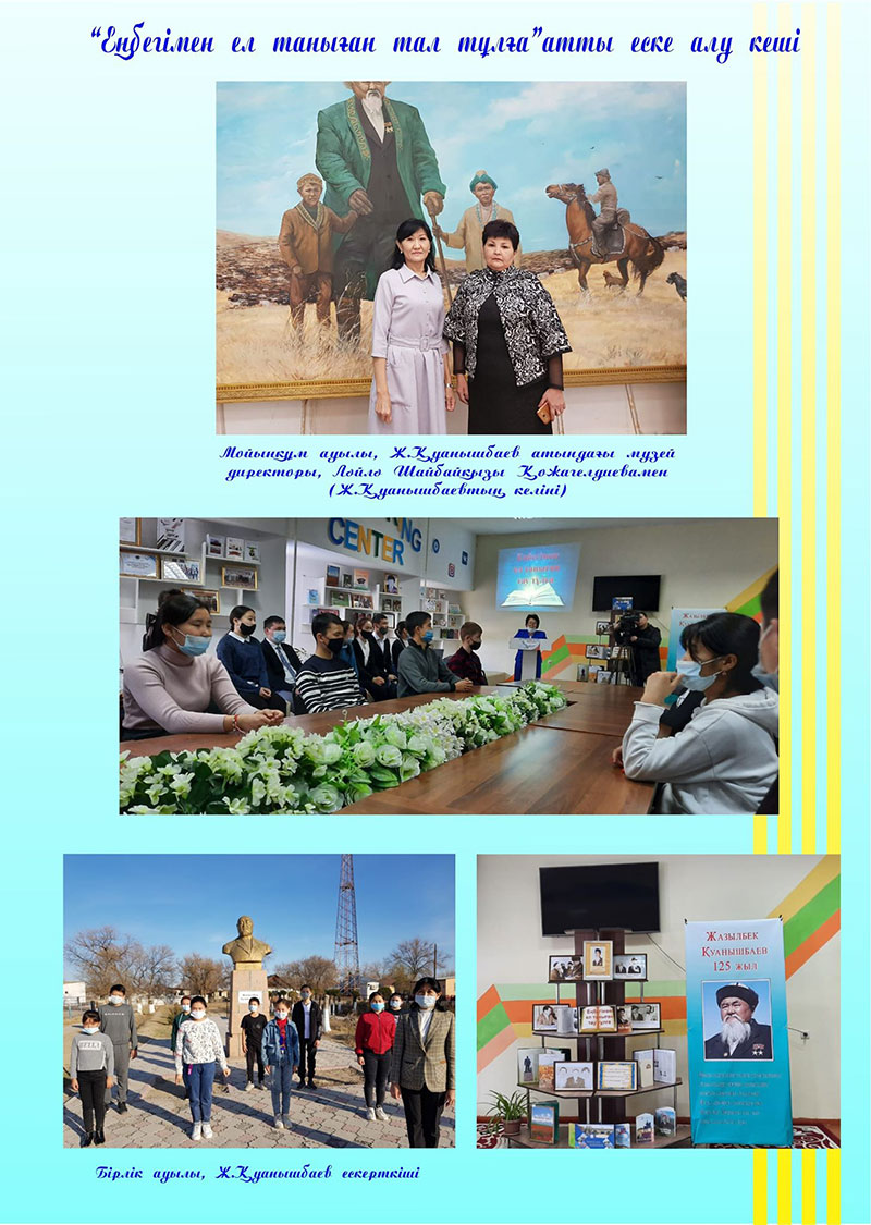 Іс-шара барысында шопан кәсібінің абыройы мен даңқын арттырып мал шаруашылығы тарихында өшпес жол қалдырған атамыздың өмірі мен еңбегі жөнінде әңгімелер айтылып, ата еңбегі туралы жазылған кітаптар таныстырылды. Сонымен қатар қорық- музей қызметкері Ләйлә Тілеубердіқызы Мойынқұм ауылындағы Ж.Қуанышбаев атындағы музейіне барып, осы музейде он жылдан аса басшылық қызмет атқарып келе жатқан шопан ата келіні Қожагелдиева Ләйлә Шайбайқызынан алынған сұхбатында атамыздың жемісті еңбегін еске алып мақтан тұтатынын тілге тиек етті. Сонымен қатар қорық-музейге қарасты монументалды ескерткіштің бірі Мойынқұм ауданы, Бірлік аулындағы Жазылбек Қуанышбаев ескерткішіне оқушыларға дәріс оқылып, «Жазылбекшілер маршы» атты әні хормен орындалды. «Шопандардың атасы», «Дала академигі», «Малшылардың маршалы» деп халқы атап кеткен атамызды біз ұрпақтары әрдайым үлгі тұтып, мақтан етеміз.
