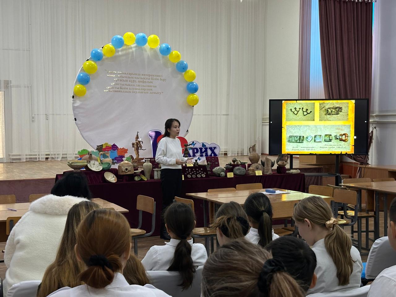Ең алдымен көне дәуірлердің естелігі, үлкен руханият орталығы болған, екі мың жылдан астам тарихы бар Тараз шаһарының тарихына тоқталып өтті. Содан соң музей-қорыққа қарасты Республикалық маңызы бар 30 тарихи-мәдени ескерткіштерінің қайталанбас тарихымен, кесенелерге қатысты әртүрлі аңыз, әңгімелермен таныстырды. Сондай-ақ, оқушылар назарына археологиялық қазба жұмыстары нәтижесінде табылған жәдігерлер ұсынылды. Жылжымалы көрмеге Қарахан мемлекеті тұсында жасалған қыш ыдыстар, құмыра, қазандар, сұйықтық сақтауға арналған сынапкөзелер, қоладан құйылған шырағдандар, су құбырлары, жасыл, ақ, қоңыр түсті табақшалар, тиындар жиынтығы және сиясауыт сынды көптеген жәдігерлер қойылды. Іс-шара соңында мектеп ұстаздары мен оқушылары музей-қорық қызметкерлеріне алғысын білдіріп, алғыс хатпен марапаттады.