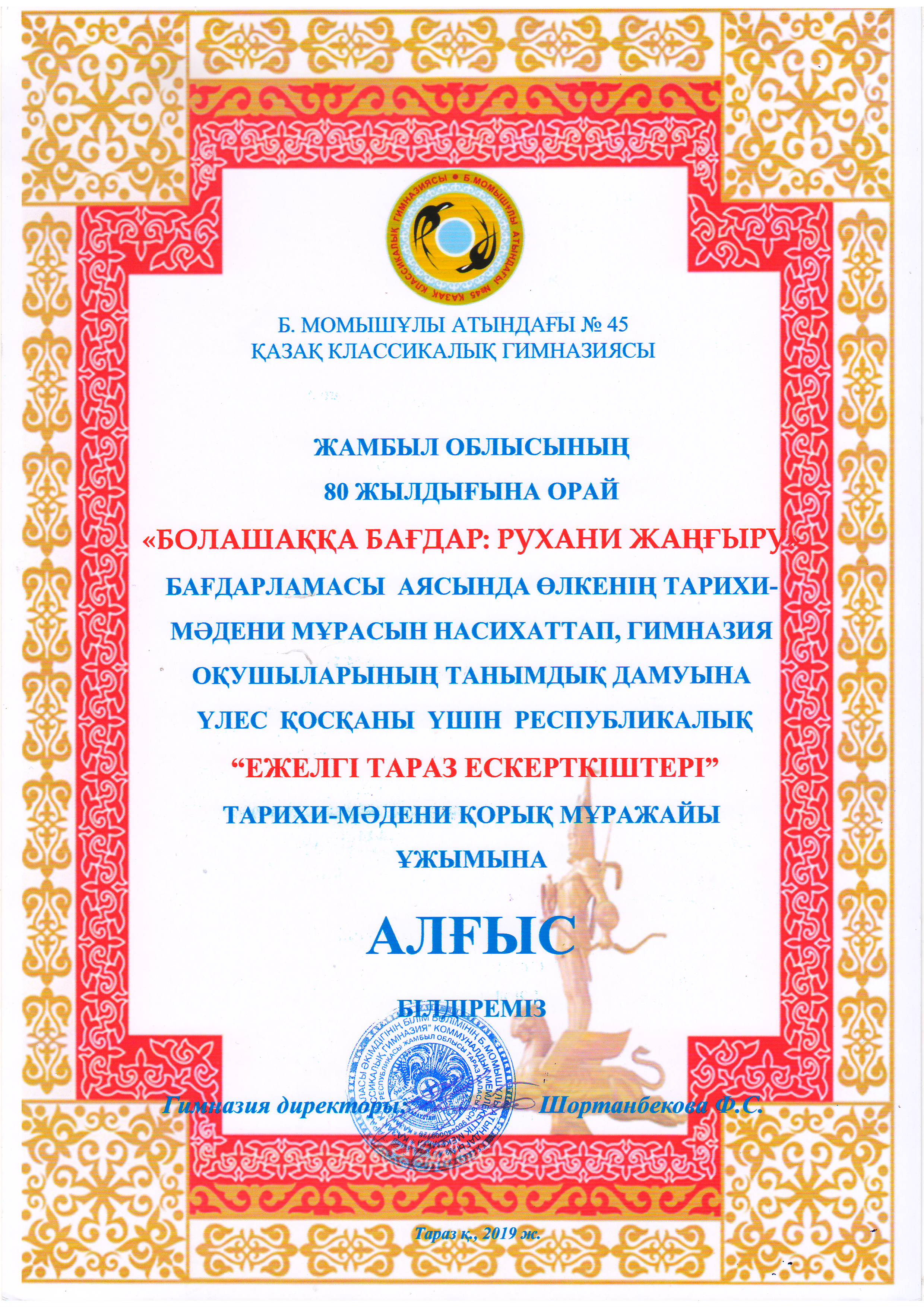 Іс-шараны ұйымдастыруда белсенділік танытқан азаматтарға Алғыс хаттар мен естелік сыйлықтар табыс етілді. Ал, аталмыш семинарды жоғары деңгейде ұйымдастырғаны, сонымен бірге көпжылдық серіктестіктегі жемісті жұмыстары үшін мемлекеттік "Ежелгі Тараз ескерткіштері" тарихи-мәдени қорық-музейі ұжымын М.Х.Дулати атындағы ТАРМУ-дың ректоры, профессор Махметқали Сарыбеков Алғыс хатпен марапаттады.