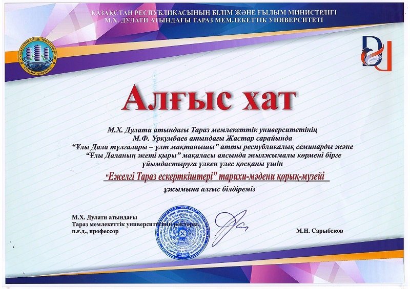 Ағымдағы жылдың жиырмасыншы ақпанында Қазақстан Республикасы Мәдениет және спорт министрлігінің мемлекеттік «Ежелгі Тараз ескерткіштері» тарихи-мәдени қорық-музейінің ұйымдастыруымен М.Х.Дулати атындағы Тараз Мемлекеттік Университетінің «Жастар сарайында» Елбасымыз Н.Ә.Назарбаевтың «Болашаққа бағдар: рухани жаңғыру», «Ұлы Даланың жеті қыры» атты мақалаларының аясында «Ұлы Дала тұлғалары – ұлт мақтанышы » атты республикалық семинар өтті.Оған ЖОО-ның профессор-оқытушылары, студенттер, қоғамдық белсенділер мен БАҚ өкілдері қатысты.