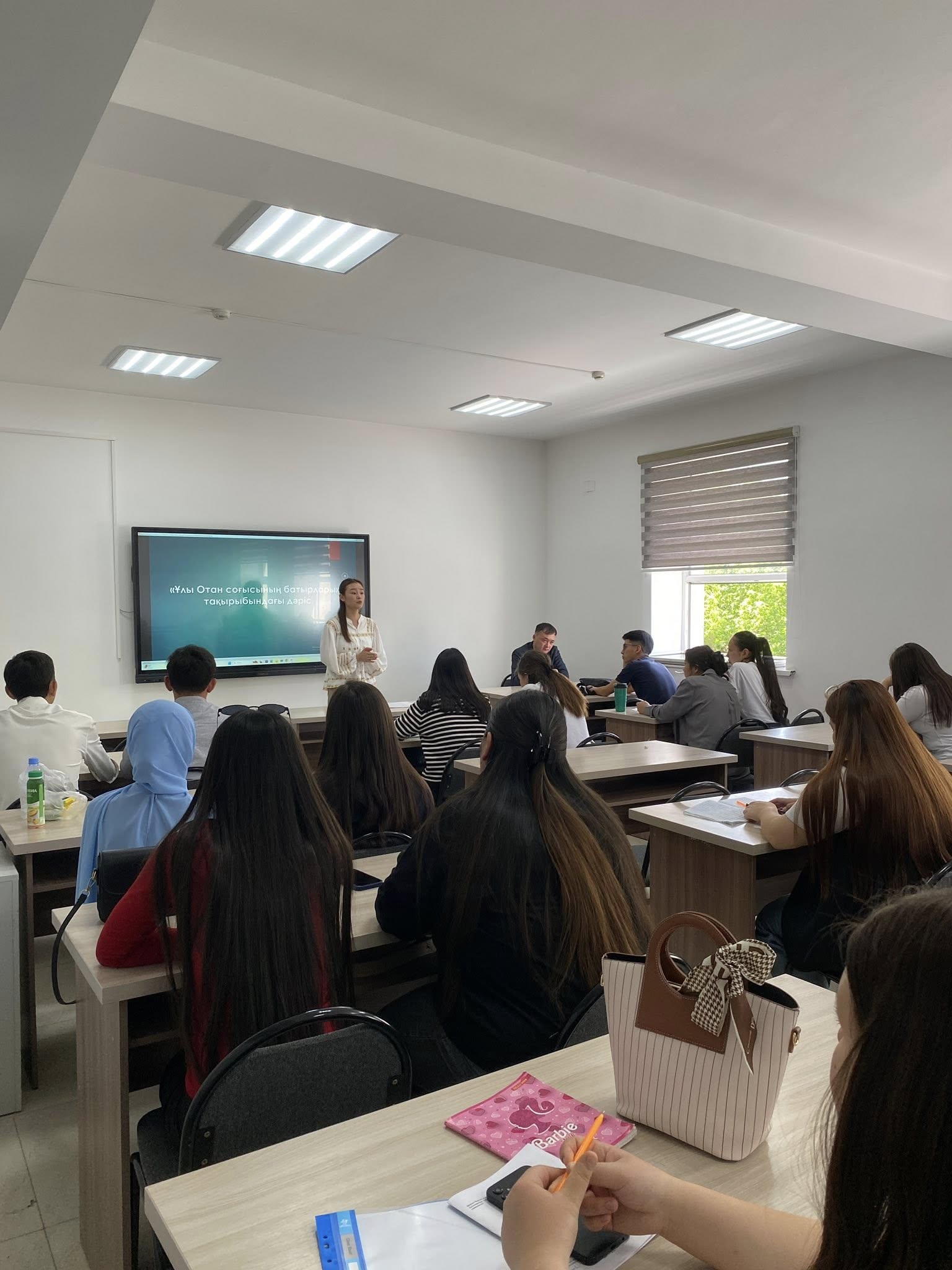«Ұрпақтар сабақтастығы арқылы жеткен Жеңіс» жалпыреспубликалық акциясы аясында «Ғылыми қызмет және ескерткіштерді қорғау» бөлімінің тарихшысы Кәрібекова Ақдидар Жәнібекқызы Ш. Мұртаза атындағы Халықаралық Тараз университетінің «Тарих» мамандығының 1-курс студенттеріне дәріс өткізді.
