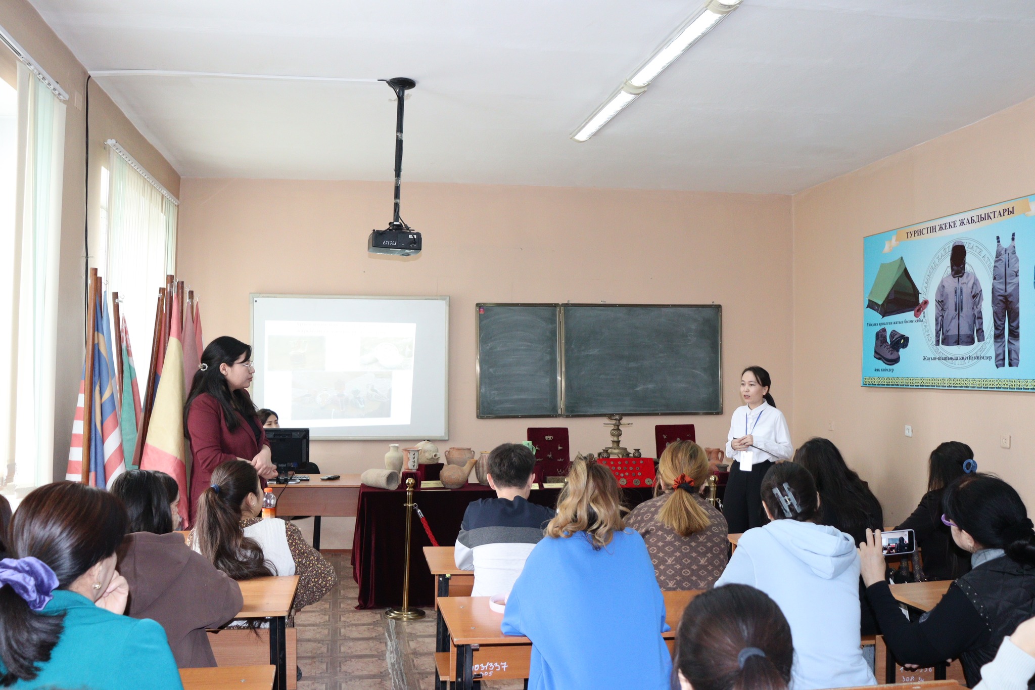 Сондай-ақ, студенттер назарына археологиялық қазба жұмыстары нәтижесінде табылған жәдігерлер ұсынылды. Атап айтсақ, әр кезеңге жататын мәдени қабаттан табылған қыш бұйымдары мен металдан жасалған бұйымдардың мерзімін, жасалу техникасы мен пайдалану мақсатын түсіндірді.