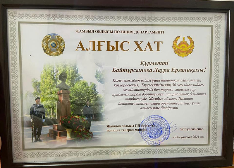 Өз кезегінде,облыстық полиция басшылығы генерал-майор Ж.К. Сүлейменов музей-қорық қызметкері Л. Байтұрсыноваға атқарған жұмысы үшін алғыс білдіріп, Алғыс хатпен марапаттады.