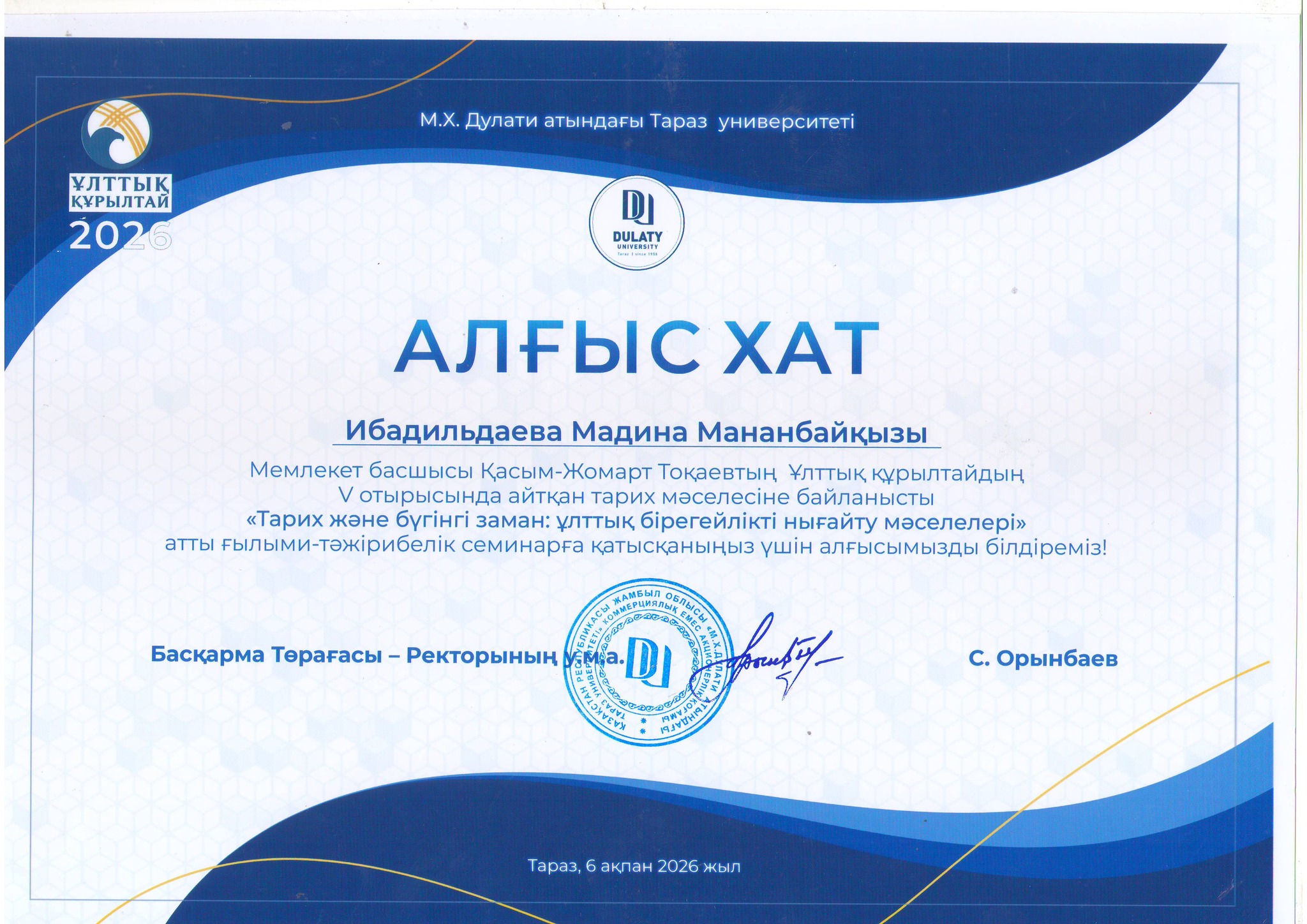 Бүгін М.Х. Дулати атындағы Тараз университетінің ұйымдастыруымен Мемлекет басшысы Қасым-Жомарт Тоқаевтың Ұлттық құрылтайдың V отырысында көтерілген тарих мәселелері аясында «Тарих және бүгінгі заман: ұлттық бірегейлікті нығайту мәселелері» атты ғылыми-тәжірибелік семинар өтті.