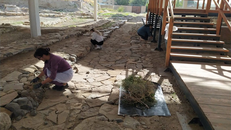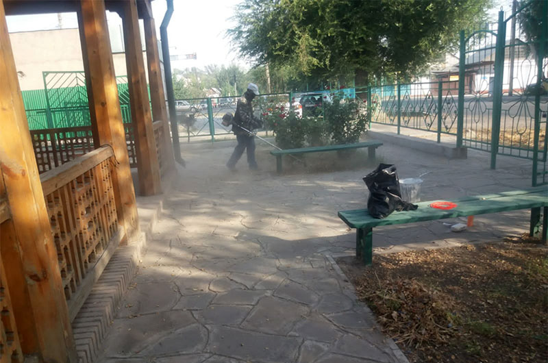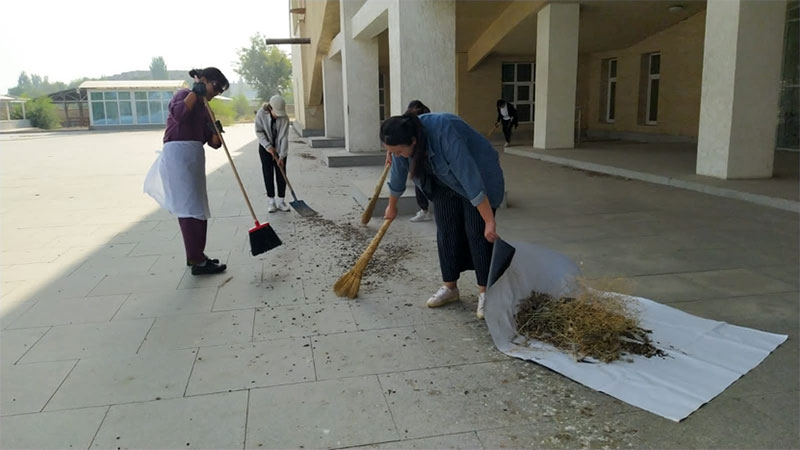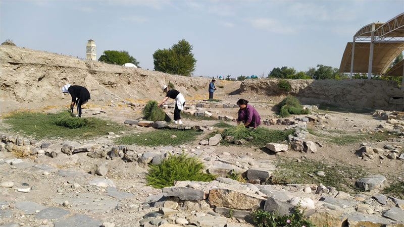 Жоспарланған тазалық жұмыстарын жүргізу және көгалдандыру «Көне Тараз» археологиялық паркінде,"Қали Жүніс"моншасында және «Қарахан», "Айша бибі" кесенелерінің аумағында жалғасуда. Бүгін "Ежелгі Тараз ескерткіштері" тарихи-мәдени қорық-музейінің қызметкерлері біріге отырып, білек сыбана кірісіп кесенелердің аумағында санитарлық тазалау,арықтар жүйелерін тазарту, тал түптерін балақтау, әктеу, күл-қоқыстан тазарту жұмыстарын жүргізді.
