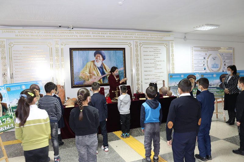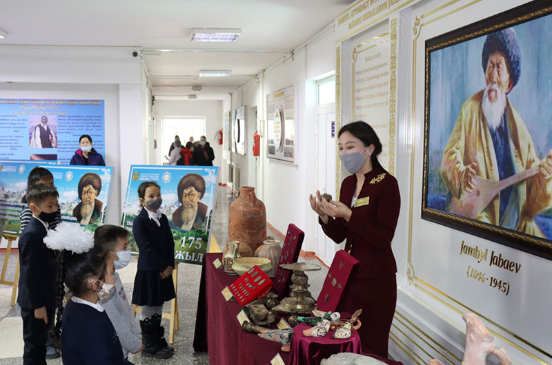 Ағымдағы жылдың 21 қаңтарында Қазақстан Республикасының Мәдениет және спорт министрлігінің «Ежелгі Тараз ескерткіштері» Мемлекеттік тарихи-мәдени қорық-музейі Тараз қаласындағы Жамбыл Жабаев атындағы №5 мектеп гимназиясында «ХХ ғасыр Гомері» деп саналған Жамбыл Жабаевтың 175 жылдығына орай «Жыр алыбы - Жамбыл» атты тақырыптық жылжымалы үйірме ұйымдастырды. Үйірме барысында оқушылардың назарына алдымен Жамбыл Жабаевтың өлеңдерінен арнайы постерлер мен киелі Тараз қаласының орнынан табылған ортағасырлық құнды да бірегей жәдігерлерден жасақталған жылжымалы көрме қойылды. Аты аңызға айналған халық ақыны, жыраулық өнерінің шебері, айтыскер - Жамбыл Жабаевтың өмірі мен шығармашылығын және мекемеге қарасты тарихи-мәдени мұрамыздың бірі - Жамбыл Жабаевтың ескерткішінің тарихы оқушыларға тереңнен жеткізілді. Жамбыл өңірінің ғана емес күллі қазақ елінің мақтанышы айналған ақынның мұрасы мәңгі ұмытылмайды.