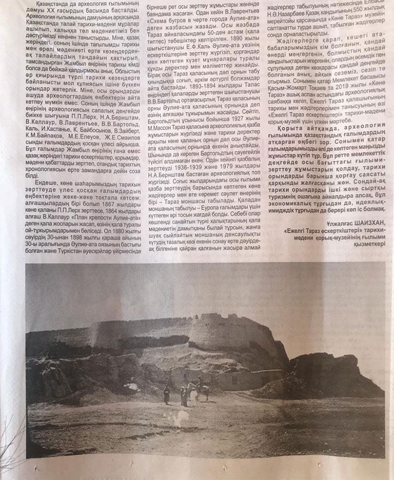 Облыстық "ARAI"газетінің 13 тамыз 2021 жыл №65(856) санында шыққан мақала "ТАРАЗДАҒЫ ТАРИХИ ОРЫНДАРДЫ ТУРИЗМНІҢ ОШАҒЫНА АЙНАЛДЫРА АЛСАҚ...