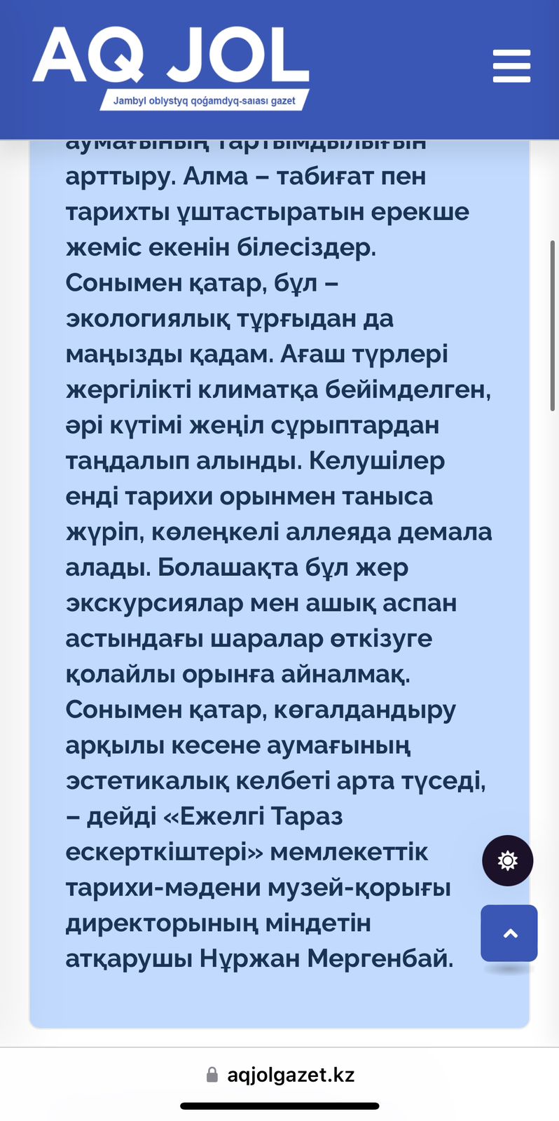 «Таза Қазақстан» экологиялық акциясына Жамбыл облысының тұрғындары белсенді атсалысуда. Экологиялық науқан аясында «Ежелгі Тараз ескерткіштері» мемлекеттік тарихи-мәдени музей-қорығының бастамасымен Тараз қаласындағы «Қарахан баба» кенесіне алма ағаштары отырғызылды. Мұндағы мақсат – келген турист, қонақтарға жайлы жағдай жасау. Акцияға «Ежелгі Тараз ескерткіштері» мемлекеттік тарихи-мәдени музей-қорығы ұжымынан бөлек, белгілі тарихшылар, мәдениет саласының мамандары , журналистер, қала тұрғындары мен жастар қатысты.